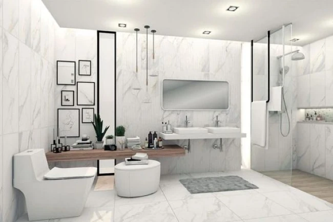 Phòng tắm là nơi thể hiện rõ nhất vai trò của sự kết hợp giữa vật liệu xây dựng và thiết bị vệ sinh. Gạch ốp lát, đá trang trí, kính cường lực và thiết bị vệ sinh cần được lựa chọn đồng bộ để tạo cảm giác liền mạch.